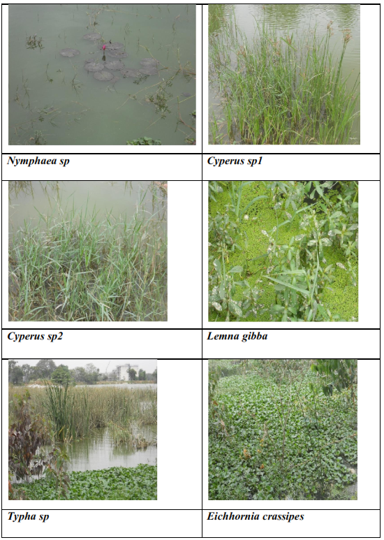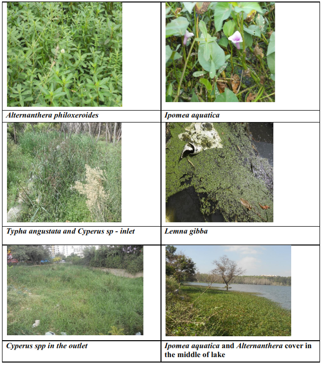 Kasavanahalli Lake: There were mainly 10 species found in Kasavanahalli Lake. Alternanthera philoxeroides, Typha angustata, Cyperus sp1, Cyperus sp2, Lemna gibba, Lemna minor, Eichhornia crassipes, Ipomea aquatica, Potomogetan natans and Nymphaea sp were the main macrophyte species found in the lake. The sewage inlet points were covered by Alternanthera philoxeroides, Lemna gibba, Lemna minor and Eichhornia crassipes which indicates high amount of nutrient in the sewage. The middle portion of the lake contained Alternanthera philoxeroides and Cyperus spp. The outlet was dominated by species like Potomogetan natans, Ipomea aquatica and Nymphaea sp.