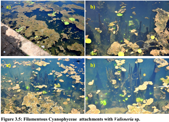 Filamentous macro algae in the peripheries of the pond were Oscillatoria sp. This species were mostly found along with organic debris and sludge masses floating on the top trapping air bubbles and are the most common bloom forming algae in the nutrient enriched waters. Most interestingly these species were also observed entangling the aquatic hydrophytes like Vallisneria spiralis, due to which the long leafs of the plant were bundled together, obstructing sunlight that inhibit photosynthesis. Further more the submerged aquatic plants also uptake nutrients through leafs, and the presence of dominant cyanophycean members such as Oscillatoria hampers the growth and productivity. Pseudoanaebaena species were also observed associated with some of the Oscillatoria clumps near the shore lines.