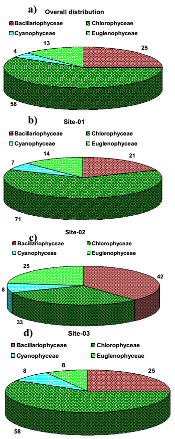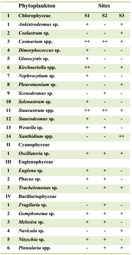 - Site 1 recorded the highest diversity (>16 species) and majority were green algae (10). In all the three sites the chlorophycean members dominated over the members of other classes. These include Cosmarium spp., Kirchneriella spp., and Staurastrum spp.