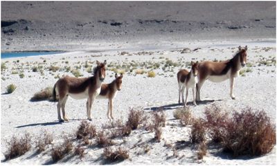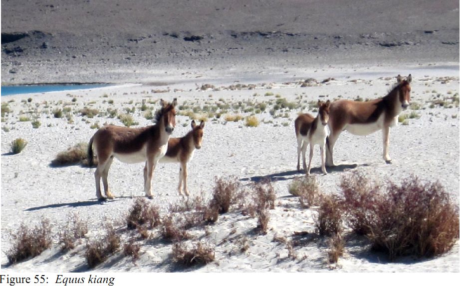 The Tibetan wild ass or Kiang (Figure 55) is the largest wild ass in the world with some stallions standing 1.4 m tall and weighing upto 400 kg. The colour is auburn with white belly, chest and legs, and morphologically the sexes are alike.