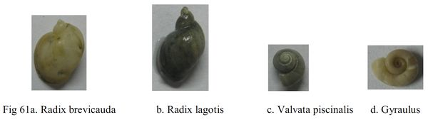 Mollusc: The Mollusc shells collected from Pangong Lake were identified using Ramakrishna and Dey (2007). Pangong Lake has four species of freshwater molluscs via. Radix brevicauda, Radix lagotis, Valvata piscinalis, and Gyraulus sp (Figure 61a to d). The distribution of Radix brevicauda, Radix lagotis, and Valvata piscinalis are reported only from Jammu and Kashmir in India. Even though, the molluscs shells collected from Pangong Lake are common in Ladakh region, these species were first time recorded from Pangong Lake. This indicates overlook or absence of biodiversity survey in the Pangong Lake, except Sharma (2000) who discovered a fossil molluscs Lymnea auricularia in ancient lacustrine clay deposits above the present level of the lake.