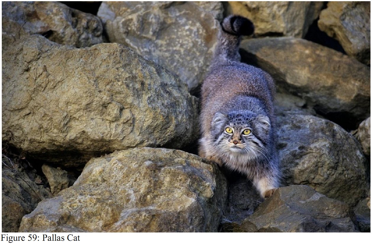 Pallas’s Cat: In India, Pallas’s Cat (Otocolobus manul) is found only in eastern Ladakh at an elevation between 3000 to 4800m. It is represented by three races and is distributed throughout Tibet, France, and Pakistan. The Pallas’s Cat in Ladakh is best seen in Rupshu/ Changthang area. The subspecies found in Ladakh is Otocolobus manulnigripectus. This cat was hunted extensively for its fur. This cat has been placed under Schedule I of the Indian Wildlife (Protection Act, 1972 and Appendex II of CITES (Shawl et al., 2008).