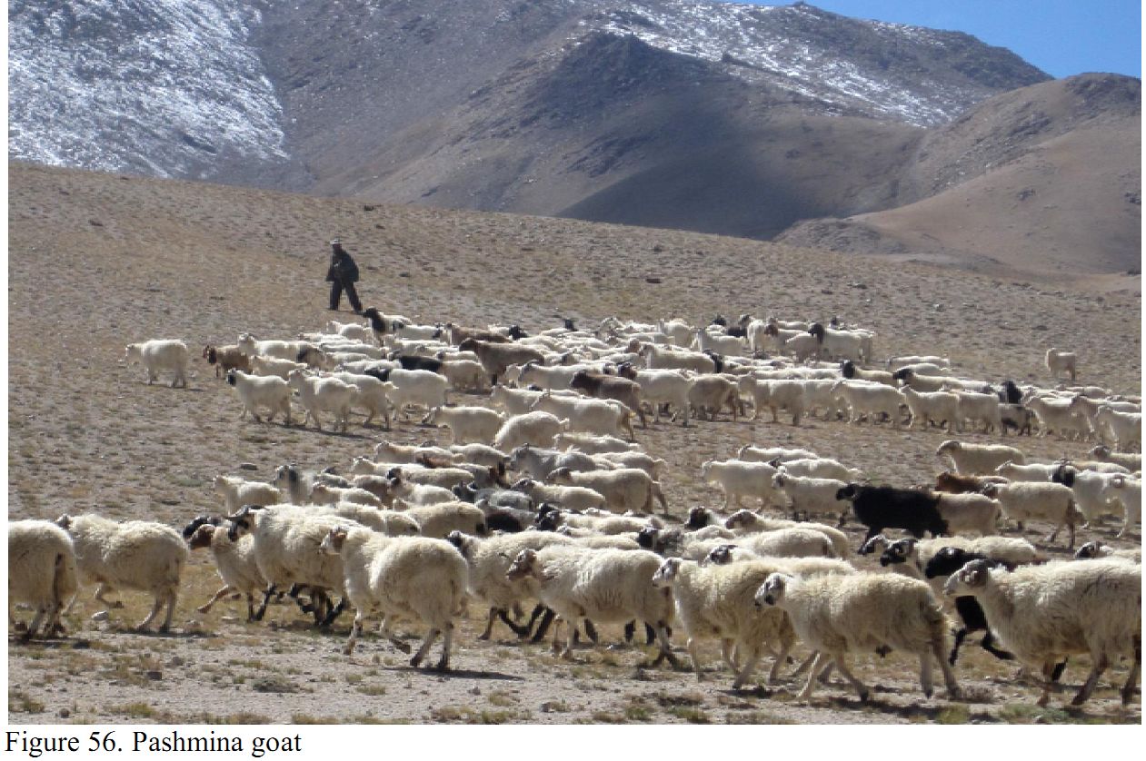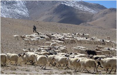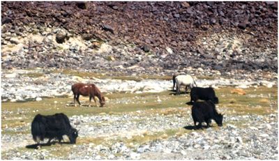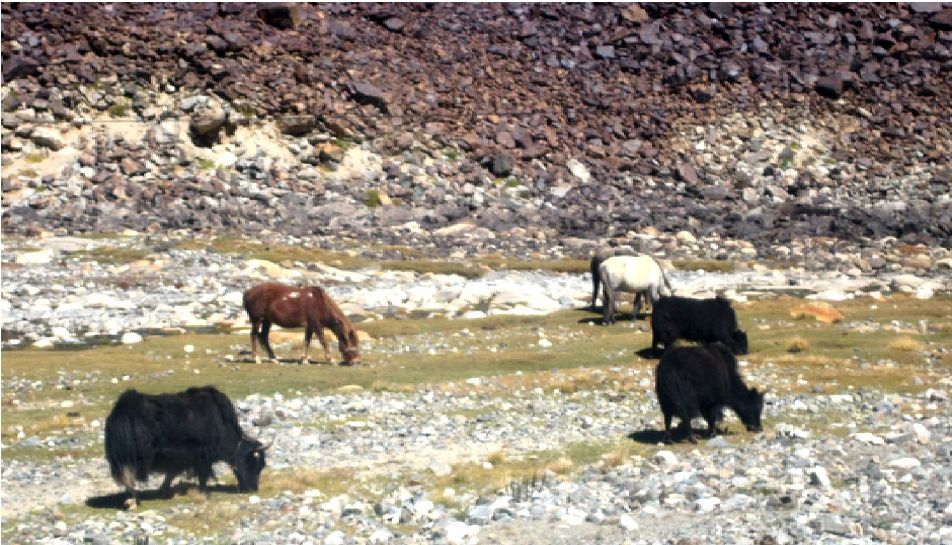 Wild yak, which is adapted to very low temperatures is quite common in this area. It is the ancestor of the domestic yak (Figure 54), which plays a pivotal role in the life of native people of Changthang in eastern Ladakh. Chiru or the Tibetan antelope is another animal that is adapted to the harsh Tibetan plateau, which extends into eastern Ladakh. It has large nasal cavities to cope up with the thin air, and soft underwool to fight against the fierce elements of the plateau. This wool also known as Shahtoosh or locally Rtsoskhul, is one of the finest animal fibers in the world. The Tibetan argali the largest wild sheep in the world, and the Tibetan gazelle are the other species here. Apart from these, there are animals that use more rugged terrains. For example, the Asiatic ibex and blue sheep are animals adapted to rugged terrain, the former more so than the latter. These ungulate species overlap in their habitat use in some areas, but they have exclusive geographical ranges in Ladakh with the ibex occurring mostly in the western part and blue sheep occurring in the eastern half, which is telltale of competitive interactions between the two. Ladakh urial endemic to the region is distributed only along two major rivers: Indus and the Shayok.