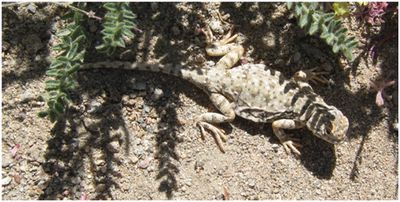 In this study, reptiles were not sited from the study region. But Toad-headed Agama (Phrynocephalus theobaldi) Figure 60, were sited near Hanley. The Toad-headed Agama is a medium sized insectivorous agama of the desert. It found in Himalayas upto 5000 m. The lizard's ear is hidden and the eyelids are strongly projected which acts as a barrier to the entrance of sand when the eyes are closed (Daniel, 2002; Murthy, 1995).