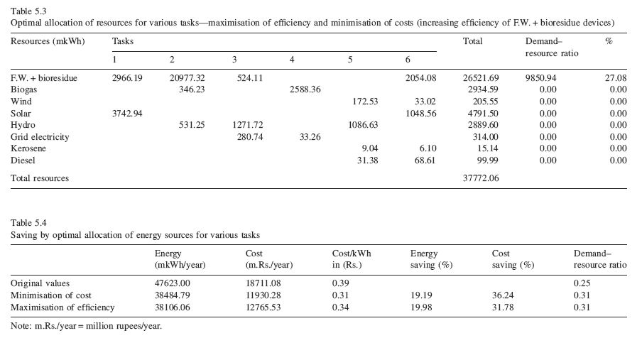 Sensitivity analyses help in identifying the role of a parameter or a set of parameters in optimal allocations. Parametric sensitivity analyses are carried out in order to analyse the effect of approximations. Sensitivity analysis is carried out for tasks by changing efficiencies of end use devices. If a source can supply either partially or fully requirements of more than one task or if the task has access to various resources for its energy needs, the type and number of transitions depend on various critical parameters, such as, unit cost of sources used by a particular task, efficiency of energy conversion of different energy paths, limits on the availability of resources if any, etc. The emerging allocation of resources for various tasks thus depends on the combination of values of critical parameters. Thus, sensitivity analyses give a clear picture as to how a single parameter or a combination of parameters influences optimal scenarios in regional energy planning exercise. This would help in a dynamic situation that may arise while implementing regional energy plan using the optimisation techniques. When the cost of biogas for cooking is taken as Rs. 0.35/m3 and wood stove efficiency is around 10%, biogas is preferred for cooking. When efficiency of wood devices is increased in steps of 5%, it is noticed that, at efficiency greater than 30%, wood stoves are preferred for cooking while biogas enters lighting option. This shows that at low level of efficiency, wood stove is not economical, as biogas or electricity generated from hydro resources in a decentralised way is inexpensive. However, this scenario changes with increase in efficiency of wood energy devices beyond 30%. Hence, between 10 and 30% efficiency of wood devices, firewood supplements the available biogas in meeting the domestic needs of a region.