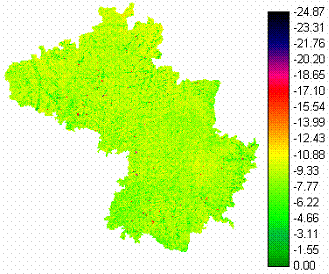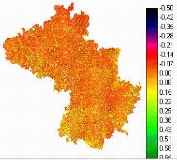 Land cover mapping was done for the Kolar district through slope and distance based vegetation indices. It is found that vegetation is sparsely distributed in Kolar district because of its semi-arid environment and pixels contain a mixture of green vegetation and soil background. Hence, in addition to slope based vegetation indices, distance based vegetation indices have been computed. This would cancel the effect of soil brightness in case where there is mixture of green vegetation and soil background. Slope based vegetation indices shows area under vegetation in Kolar district ranges from 47.65 % to 49.05%, while in distance based vegetation indices it ranges from 40.40% to 47.41%. Table 1 provides area under vegetation considering slope and distance based vegetation indices. NDVI for Kolar district is given in Fig.3. Table 1: Land cover analysis of Kolar district with different VI aspects