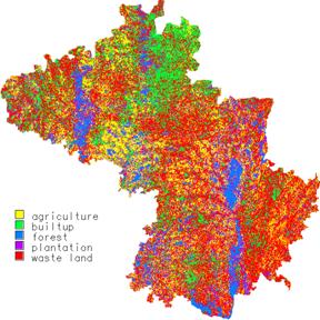 Land cover maps were verified through field investigations using calibrated (with known benchmarks and digital SOI topographic maps) GPS. Overall accuracy and the kappa statistics were computed. Validation of classified data indicates that the distance based vegetation index TSAVI1 is suitable for dry (semi arid) regions with scanty vegetation cover (Fig. 4) while NDVI is suitable for the regions with relatively good vegetation cover. Overall accuracy of land cover classification is 88.5%. in the case of TSAVI1 (in regions dominated by soil). While it is 90% for NDVI in the region with good vegetation cover and 54% in the regiond dominated with soil. Comparative analyses of vegetation indices indicate that slope based vegetation index NDVI is appropriate for the regions with a good vegetation cover. Fig. 3: NDVI of Kolar district Fig. 4: TSAVI1 of Kolar district Land use analysis was done by both Supervised classification (accuracy 94.67 %) and unsupervised classification (accuracy 78.08 %) approaches. Supervised classification was done using Gaussian maximum likelihood classifier (GMLC) to classify the data in to five categories (agriculture, built-up, forest, plantation and waste land) as depicted in Fig. 5. The composition of land use categories (agriculture, forest, plantation, built-up and wasteland) are listed in Table 2. Figure 5: Classified image Table 2: Land use details of Kolar district