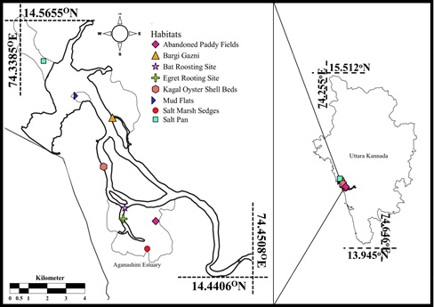 The Aganashini (lat. 14° 27' 53.6'' N to 14° 31’ 18.8” N, long. 74° 29' 26.8'' E to 74° 20’ 54.4” E) is a west flowing river from the central Western Ghats mountain ranges in the Uttara Kannada district of Karnataka state, India. The 121 km long river that has confluence with the Arabian Sea, a pristine and highly productive estuary, through which the high tide moves almost 27 km upstream, more in the driest months of summer (Boominathan et al. 2008). Totally eight lentic and lotic habitats (4+4) were chosen for sampling in this estuary based on the floral and faunal assemblages and water quality. Among these sampling locations, bat roosting site (BRS), egret roosting site (ERS), Kagal-oyster shell bed (KOSB) and mudflats (MF) fall under the estuarine lotic habitat whereas other four sites are lentic with prolonged water retention time despite diurnal tidal variations. The lentic sites are estuarine rice fields (gaznis) and are separated from the estuary by embankments fitted with sluice gates (for adjusting the water levels) and are always in submerged/water-logged state (Fig. 1).