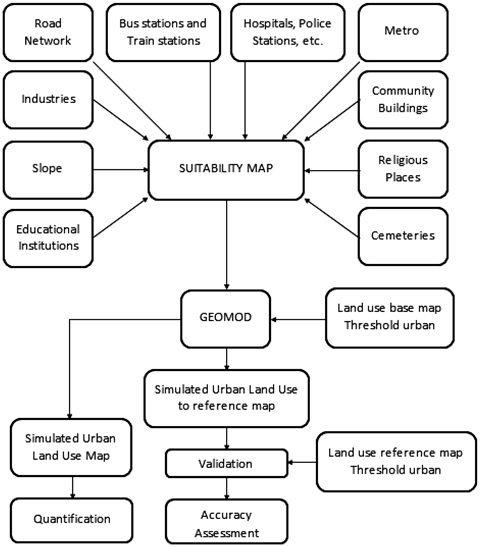 Modelling land use scenarios GeoMod was used for modelling the land use pattern and to predict the future scenarios. GeoMod is built on a grid-based model that persists the maps as grids of data to simulate the urban pattern of land use change and has a capability to predict both as time forward or time backwards (Pontius and Schneider 2001; Pontius et al. 2001; Dushku and Brown 2003). GeoMod works on a binary map and simulates the land use change based on this binary map as two categories (binary images are first created as urban and non-urban). Map considered as a base to predict is both as time forward or time backwards (Pontius and Schneider 2001; Pontius et al. 2001; Dushku and Brown 2003). GeoMod works on a binary map and simulates the land use change based on this binary map as two categories (binary images are first created as urban and non-urban). Map considered as a base to predict is supplied by the user and map to be used as validation is also used (in case of validation) else only the grid cells are mentioned, along with the land use change driver’s associated with weights. This grid are assigned as one of the two categories for the ending time based on the various decision rules.